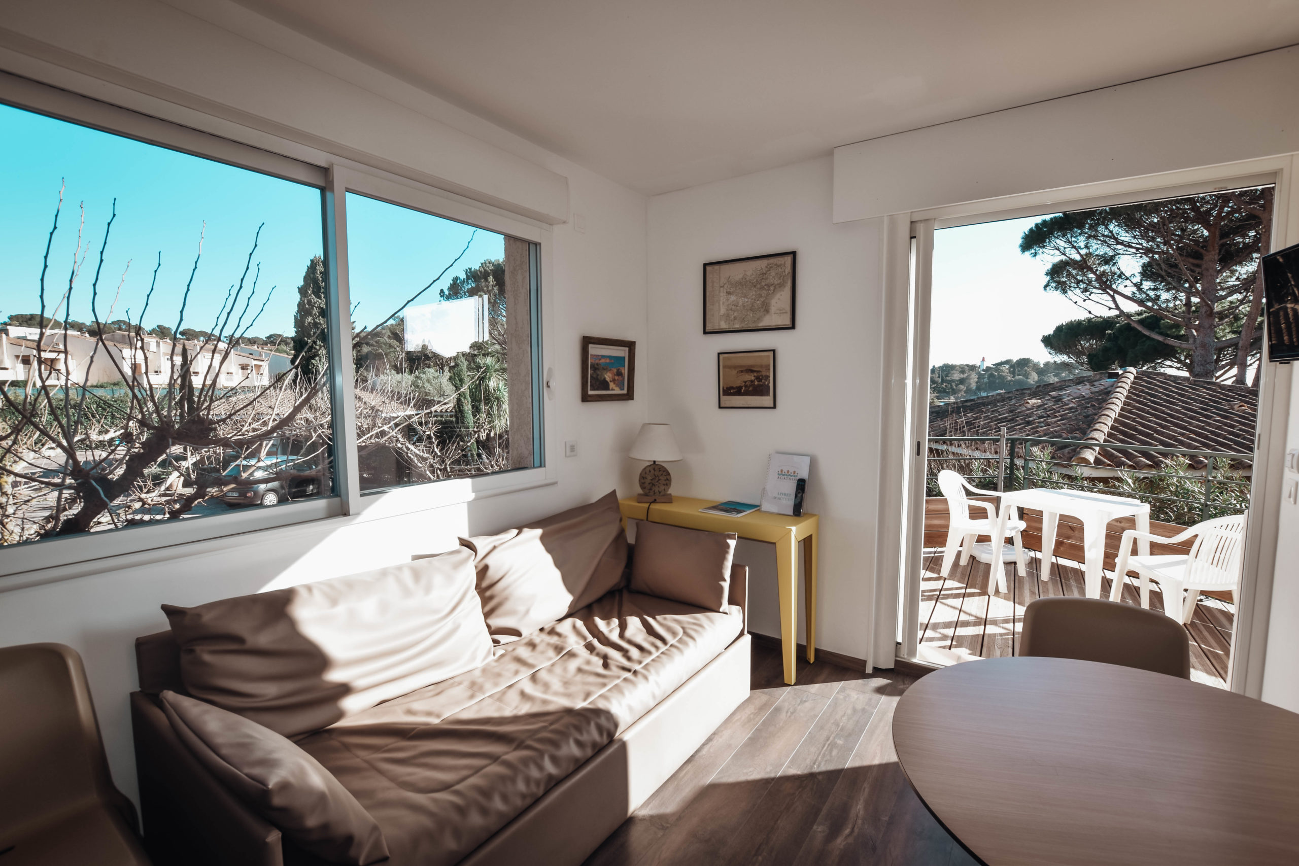 A dix mètres du jardin, il se distingue des bastidons car situé à l’étage, accessible par un escalier. Il a vue sur mer qui surplombe la résidence, et est équipé d’une vraie cuisine avec un grand frigo, un lave-vaisselle, un four et la climatisation. L’appartement est idéal pour les couples avec un bébé, car il est situé au calme et dispose d’une plus grande chambre.